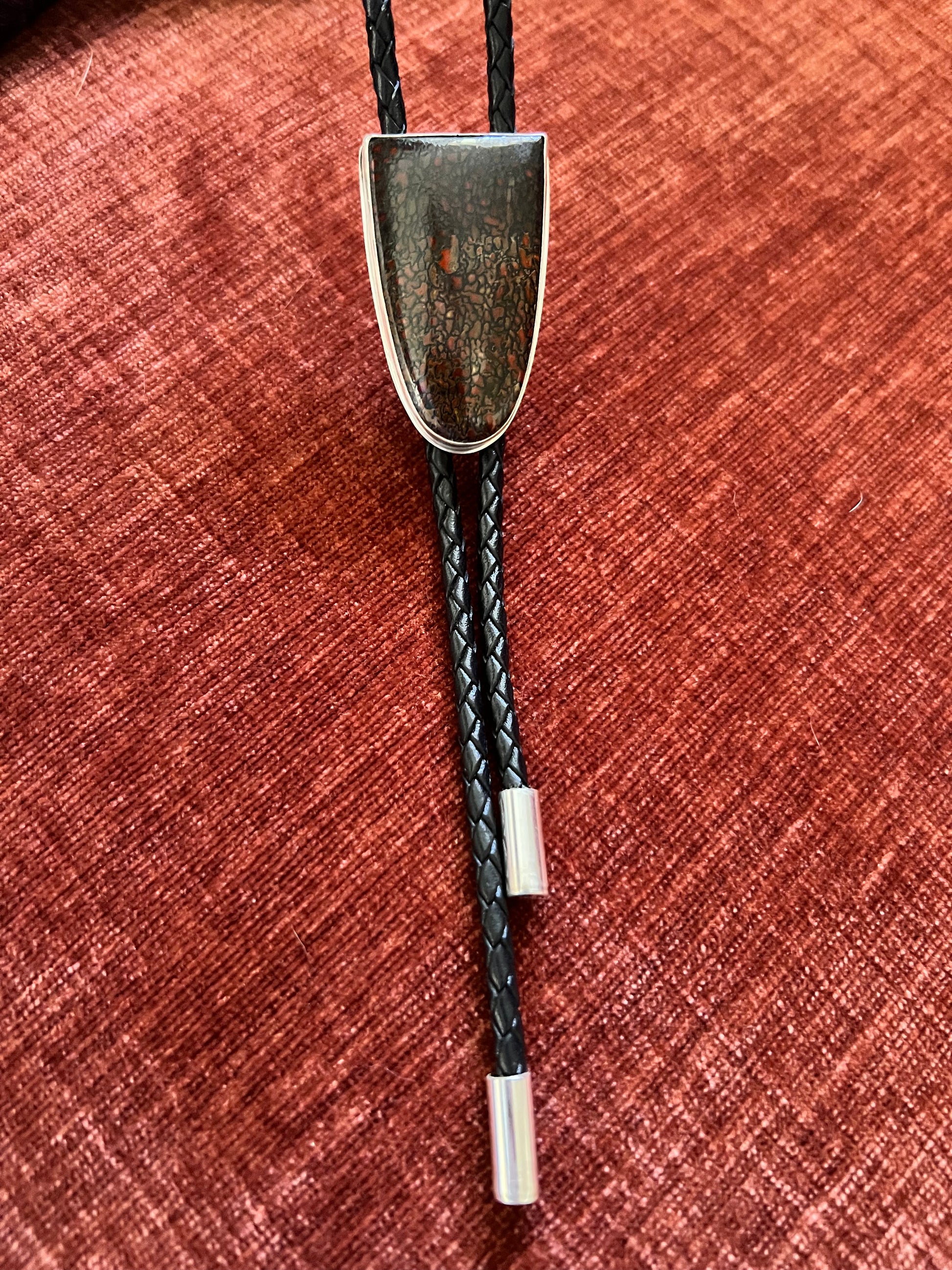 This huge piece of Petrified Dinosaur Bone is set in sterling silver with a brass bolo back. The unique shape comes together with the two-tone quality of the red and black hues of the stone to create a piece that is completely one of a kind.