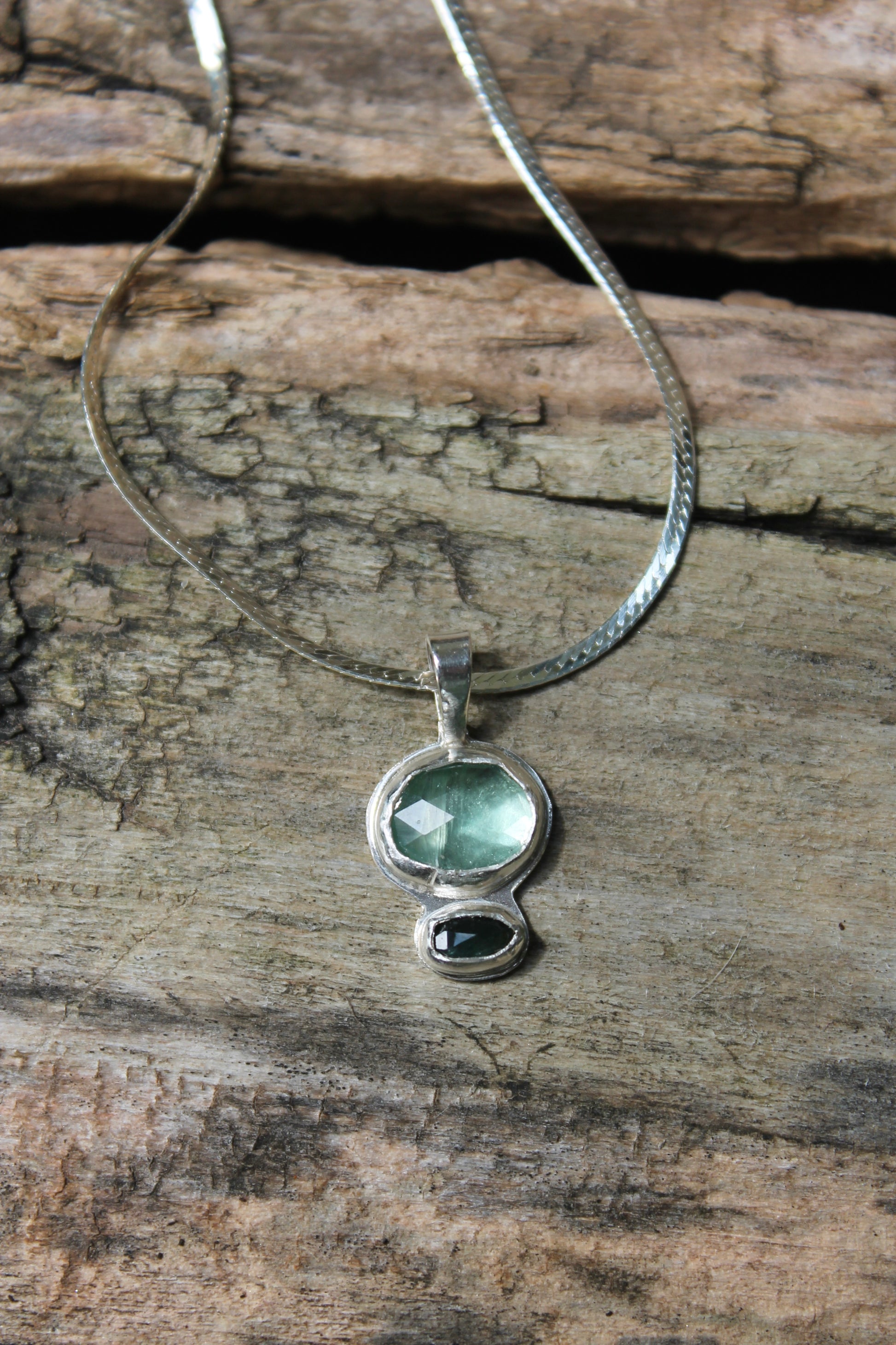 This sterling silver necklace features a faceted tourmaline and parti sapphire, each stone catching light in its own unique way. Suspended on a 16" sleek herringbone chain, the piece celebrates the interplay of color, texture, and motion.